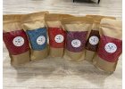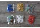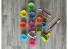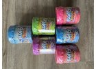 Smyslový materiál kinetický písek Fluffy floss ve čtyřech barvách: modrá, růžová, fialová a zelená.